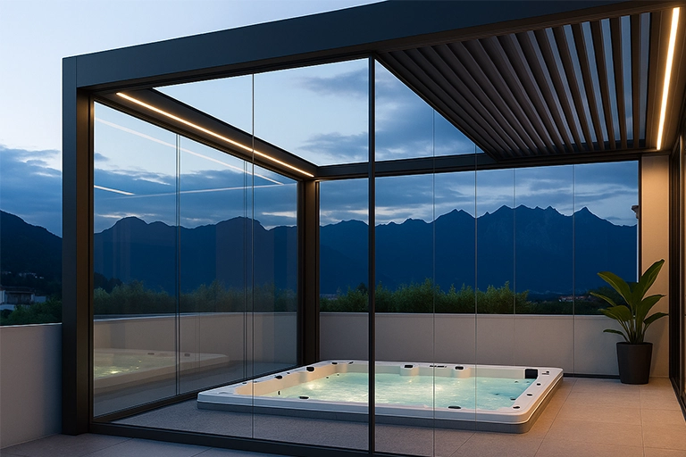 Combinar una pérgola bioclimática con Cortinas de Cristal transforma tu terraza en un auténtico Jardín de Invierno: un espacio protegido, luminoso y utilizable durante todo el año.